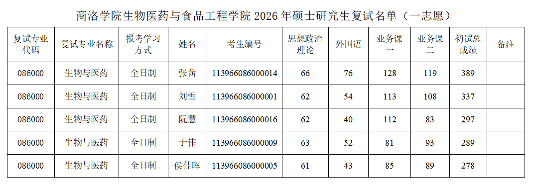 生物医药与食品工程学院2026年硕士研究生复试名单(一志愿)