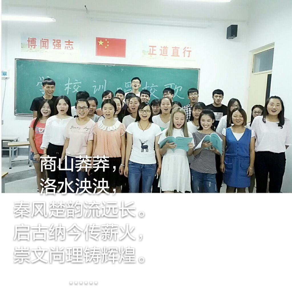在五号楼的教室里洋溢着青春的气息“ 商山莽莽,洛水泱泱,秦风劲烈楚韵长。启古纳今传薪火,崇文尚理铸辉煌。教坛播真知,丹心迎朝阳。英才济济,圣殿堂堂,五洲四海胸中藏。”教学楼内不时的传来庄严的校歌。15级的同学们以班级为单位利用课余时间,一一组织了主题团日活动;2016级的新生同学们在军训结束后,利用晚自习时间与入学教育、主题班会相结合,在学校校纪校规的同时,丰富了校园文化活动。主题团日活动旨在为即将到来的校庆烘托气氛,强化同学们爱校荣校意识,学校训增强了同学们的校纪校规观念。通过活动开展让所有学生了解商院历史、传承学院精神、立志奋发学习。