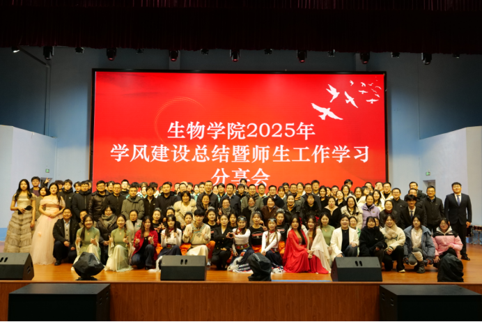 岁末年初,万象更新。生物学院在2026年元旦佳节到来之际举办学风建设总结暨师生工作学习分享会,目的就是要大力弘扬“重教行道 守正出新”的良好教风,大力倡导“勤学尚德 明辨笃行”的学风,高扬理想主义的旗帜,唱响奋斗主旋律,努力营造教师乐教、学生好学、共同学习、共同进步的良好环境和氛围。此次活动,不仅是一次学风建设成果的检阅与经验的交流,也是一场师生情谊的联结与学院精神的凝聚,进一步夯实了学院勤学善思、互助共进的学风根基,为人才培养与事业高质量发展注入了源源动力。